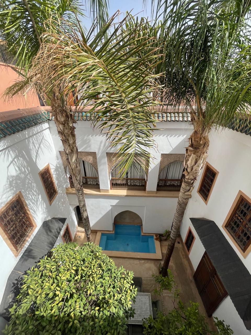 Located in Diour Jedad, Bab Doukala, this titled riad offers direct car access and approximately 600 m² of total living space, including the terrace, on a 234 m² footprint.